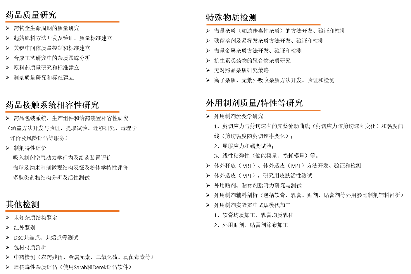 北京新領(lǐng)先醫(yī)藥科技發(fā)展有限公司分析測(cè)試中心面向國內(nèi)外藥企提供檢測(cè)技術(shù)服務(wù),積累了豐富的藥物質(zhì)量研究經(jīng)驗(yàn),主要提供痕量物質(zhì)如遺傳毒性雜質(zhì)、元素雜質(zhì)、殘留溶劑、聚合物雜質(zhì)、復(fù)雜制劑輔料剖析、藥品接觸系統(tǒng)相容性研究等符合NMPA、FDA、EMA等法規(guī)要求的研究檢測(cè)服務(wù)。本中心先后通過了ISO9001質(zhì)量管理體系認(rèn)證和中國合格評(píng)定國家認(rèn)可委員會(huì)(CNAS)實(shí)驗(yàn)室認(rèn)可資質(zhì)。