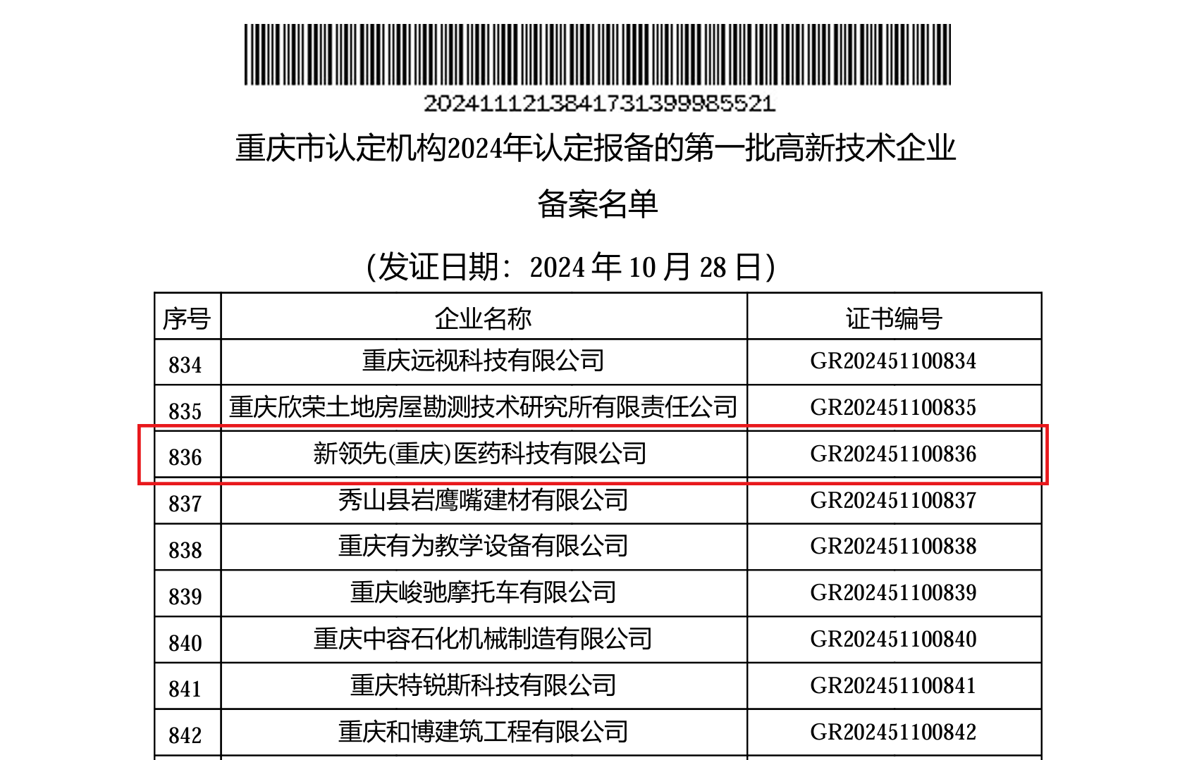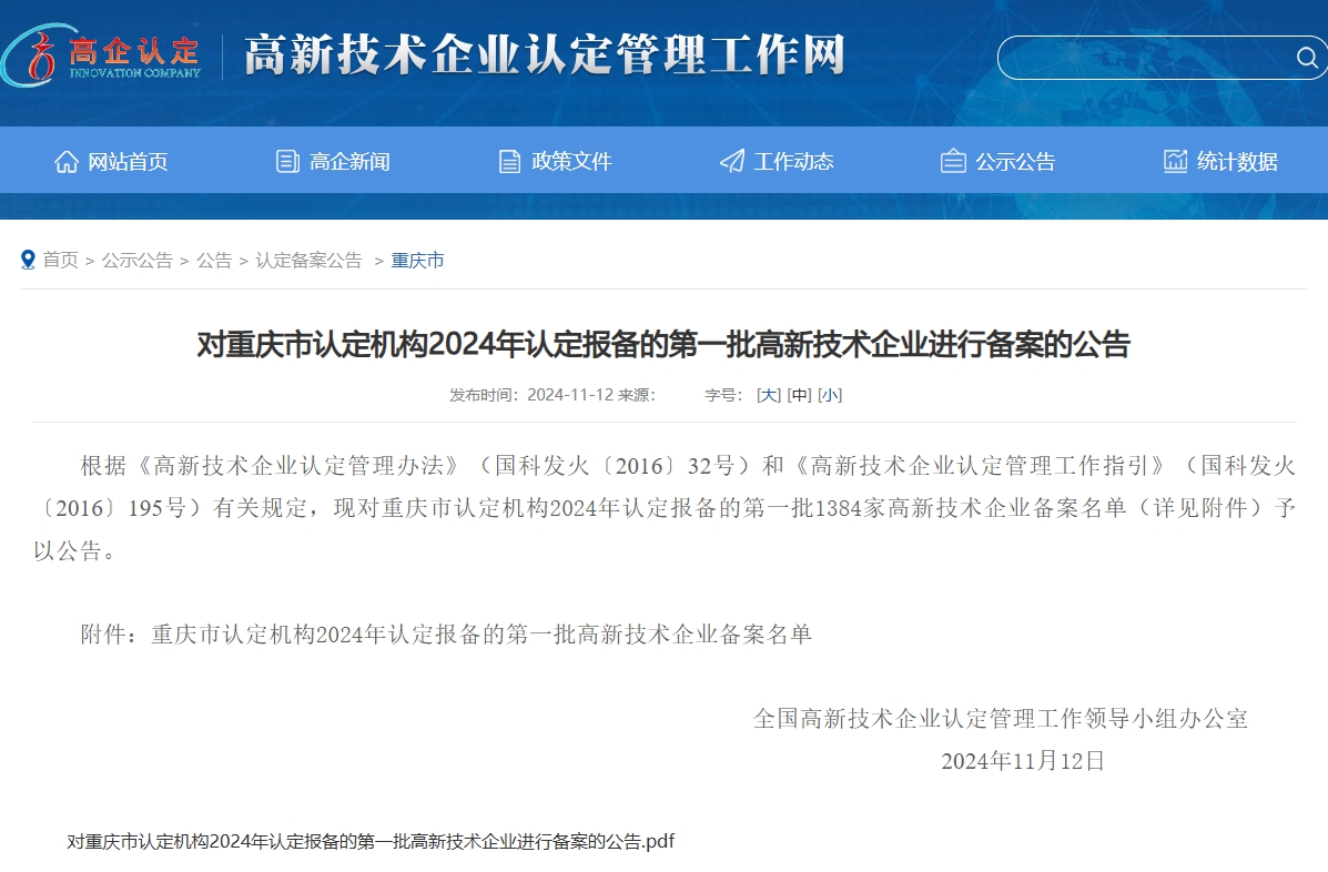 近日,國(guó)家高新企業(yè)技術(shù)認(rèn)定管理工作網(wǎng)發(fā)布《對(duì)重慶市認(rèn)定機(jī)構(gòu)2024年認(rèn)定報(bào)備的第一批高新技術(shù)企業(yè)進(jìn)行備案的公告》,新領(lǐng)先(重慶)醫(yī)藥科技成功通過(guò)國(guó)家“高新技術(shù)企業(yè)”認(rèn)定!