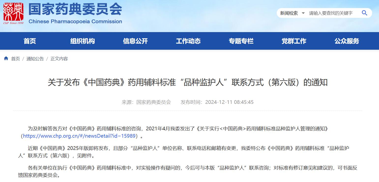 關于發(fā)布《中國藥典》藥用輔料標準“品種監(jiān)護人”聯(lián)系方式(第六版)的通知
