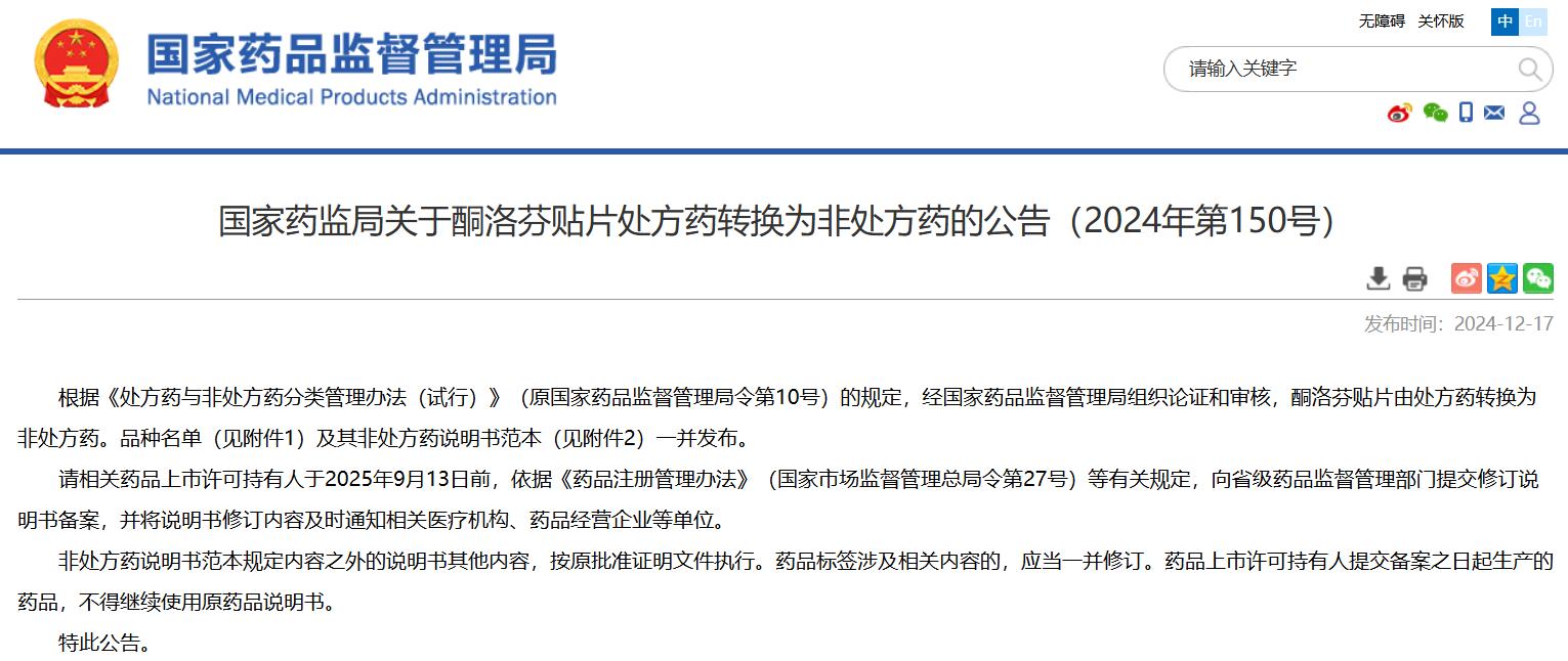 國家藥監(jiān)局關(guān)于酮洛芬貼片處方藥轉(zhuǎn)換為非處方藥的公告(2024年第150號(hào))