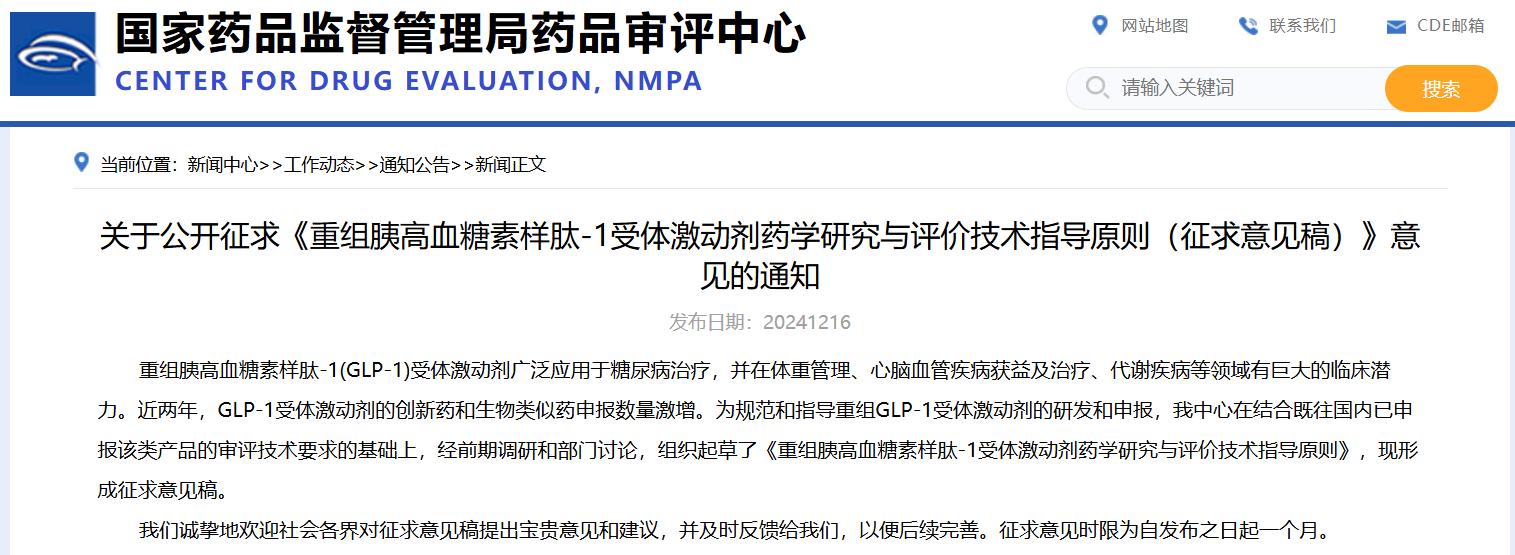 關(guān)于公開征求《重組胰高血糖素樣肽-1受體激動(dòng)劑藥學(xué)研究與評價(jià)技術(shù)指導(dǎo)原則(征求意見稿)》意見的通知