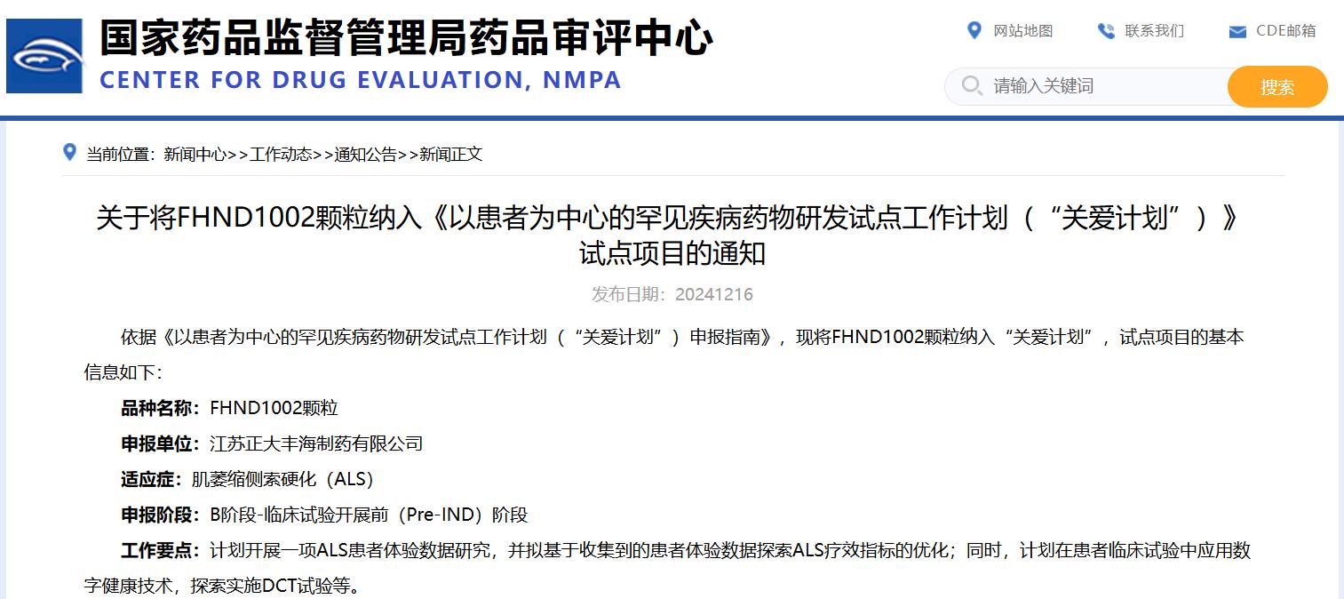 關(guān)于將FHND1002顆粒納入《以患者為中心的罕見疾病藥物研發(fā)試點(diǎn)工作計(jì)劃(“關(guān)愛計(jì)劃”)》試點(diǎn)項(xiàng)目的通知