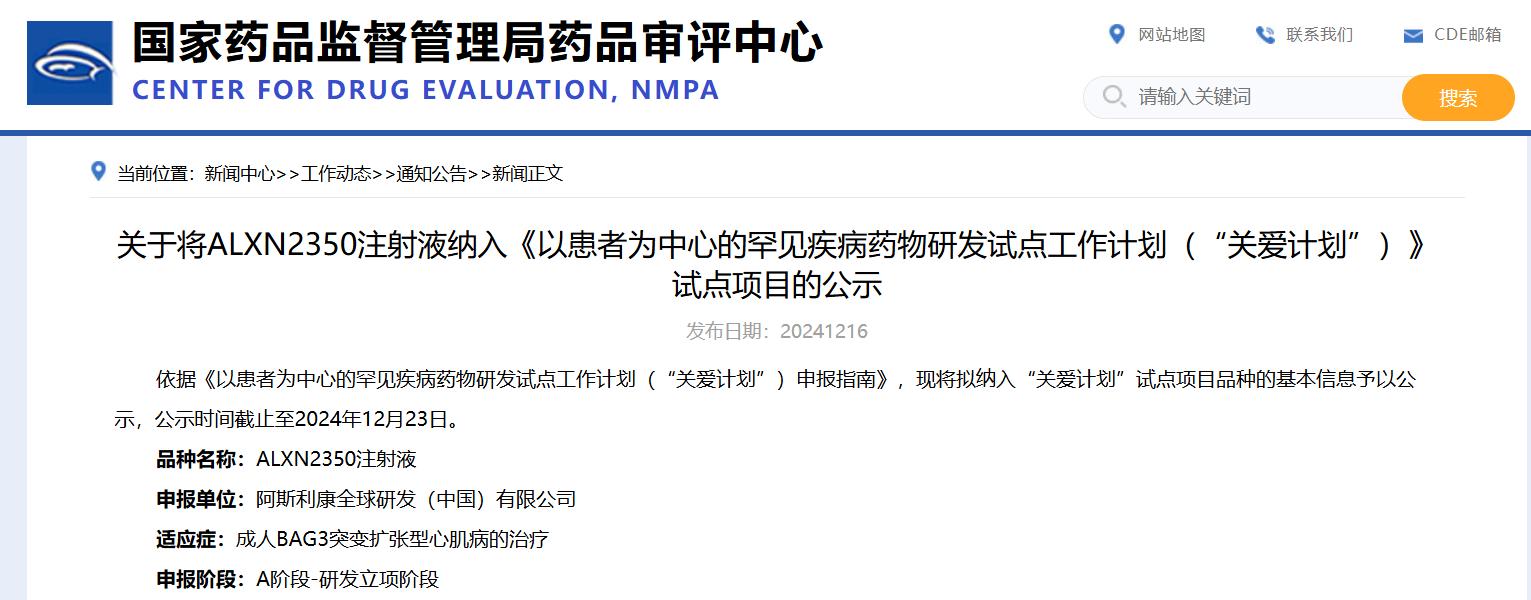 關(guān)于將ALXN2350注射液納入《以患者為中心的罕見疾病藥物研發(fā)試點(diǎn)工作計(jì)劃(“關(guān)愛計(jì)劃”)》試點(diǎn)項(xiàng)目的公示