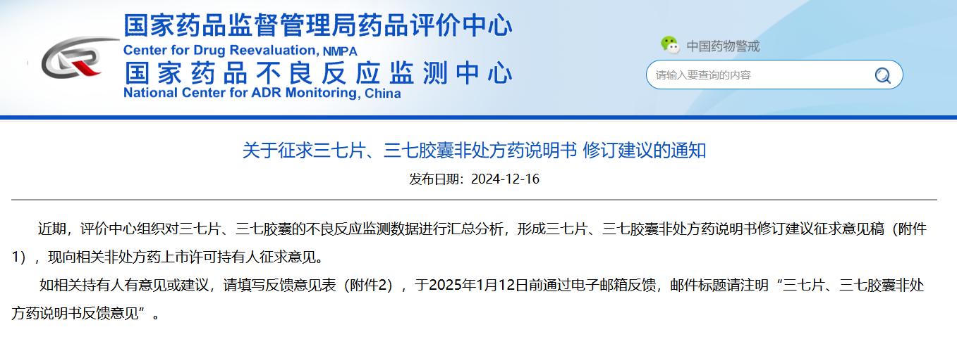 關(guān)于征求三七片、三七膠囊非處方藥說明書修訂建議的通知