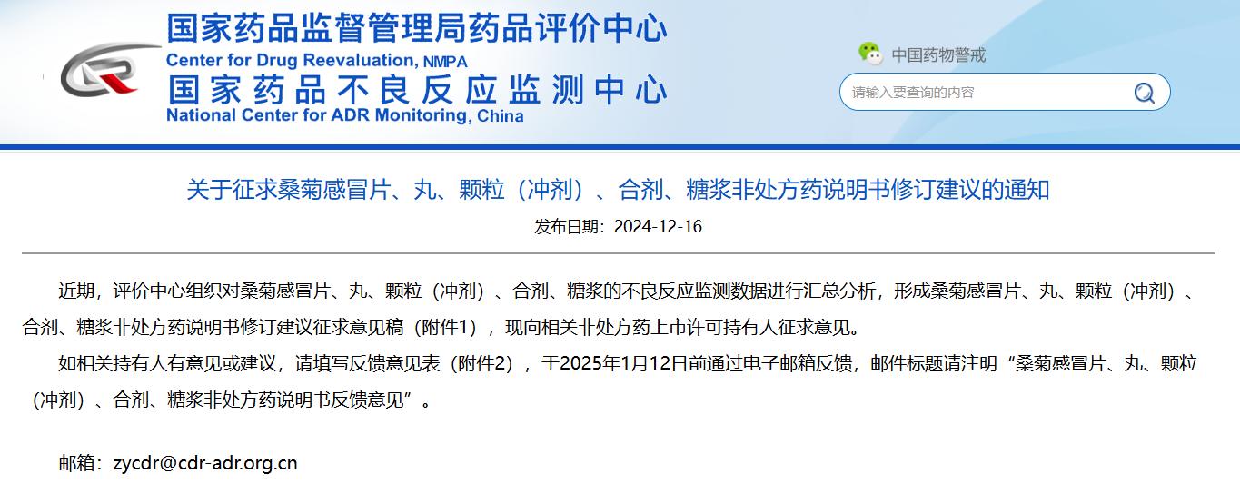 關(guān)于征求桑菊感冒片、丸、顆粒(沖劑)、合劑、糖漿非處方藥說明書修訂建議的通知