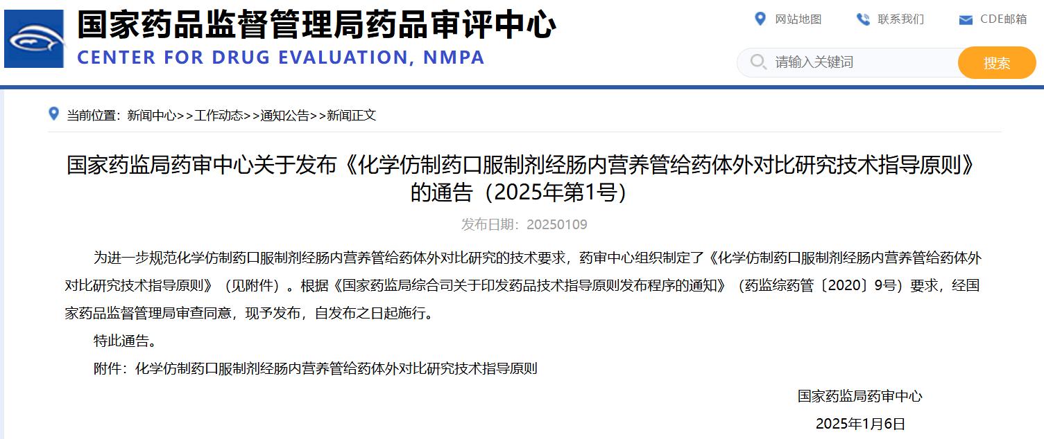 國家藥監(jiān)局藥審中心關于發(fā)布《化學仿制藥口服制劑經(jīng)腸內(nèi)營養(yǎng)管給藥體外對比研究技術指導原則》的通告(2025年第1號)