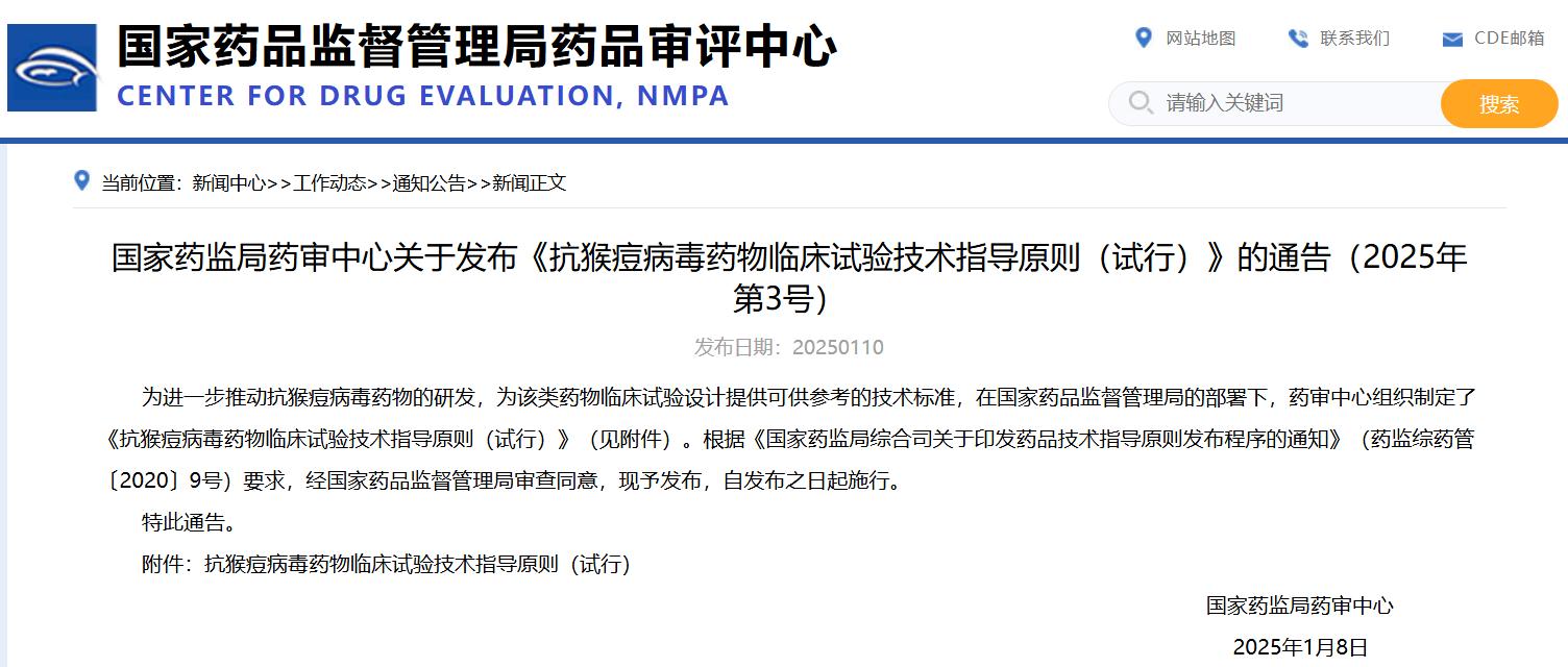 國家藥監(jiān)局藥審中心關于發(fā)布《抗猴痘病毒藥物臨床試驗技術指導原則(試行)》的通告(2025年第3號)
