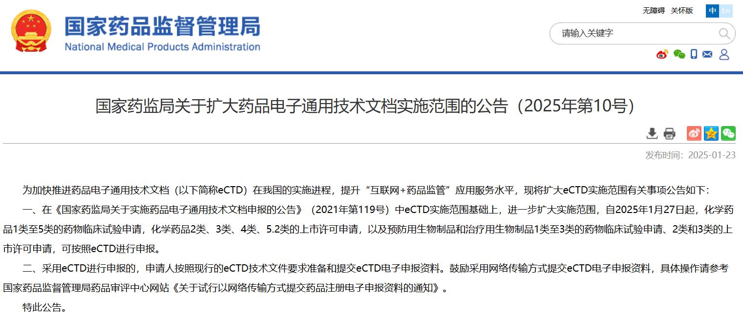 國(guó)家藥監(jiān)局關(guān)于擴(kuò)大藥品電子通用技術(shù)文檔實(shí)施范圍的公告(2025年第10號(hào))