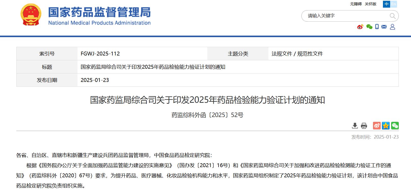 國(guó)家藥監(jiān)局綜合司關(guān)于印發(fā)2025年藥品檢驗(yàn)?zāi)芰︱?yàn)證計(jì)劃的通知