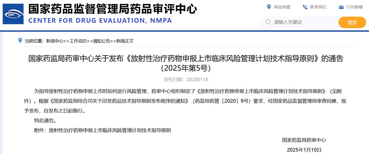 國(guó)家藥監(jiān)局藥審中心關(guān)于發(fā)布《放射性治療藥物申報(bào)上市臨床風(fēng)險(xiǎn)管理計(jì)劃技術(shù)指導(dǎo)原則》的通告(2025年第5號(hào))