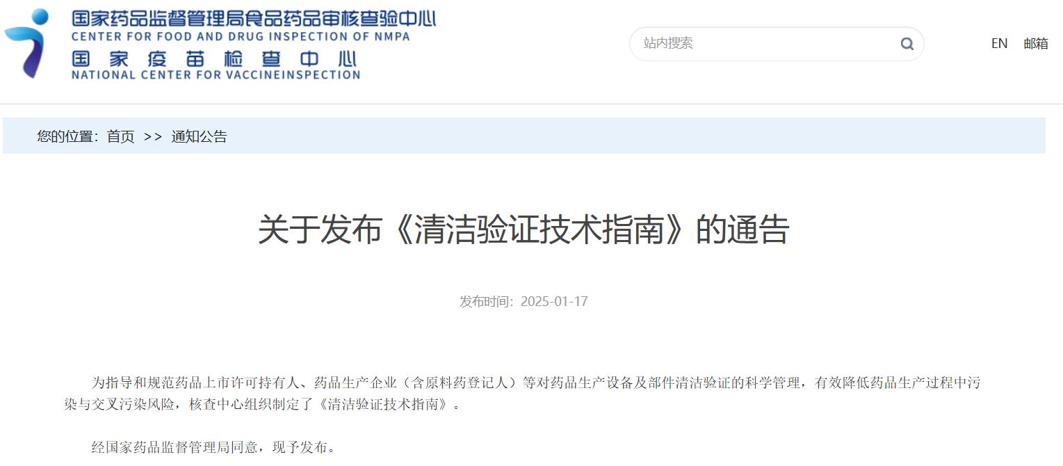 國(guó)家藥監(jiān)局核查中心關(guān)于發(fā)布《清潔驗(yàn)證技術(shù)指南》的通告