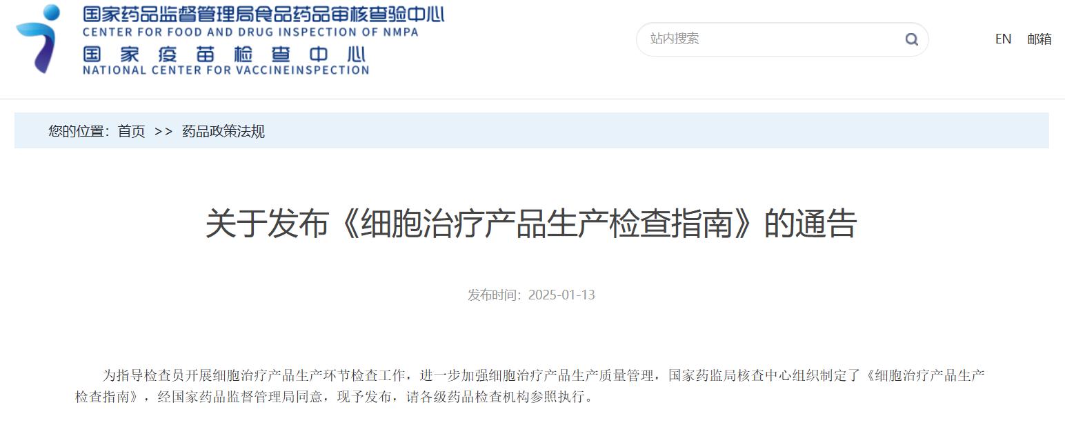 國(guó)家藥監(jiān)局核查中心關(guān)于發(fā)布《細(xì)胞治療產(chǎn)品生產(chǎn)檢查指南》的通告