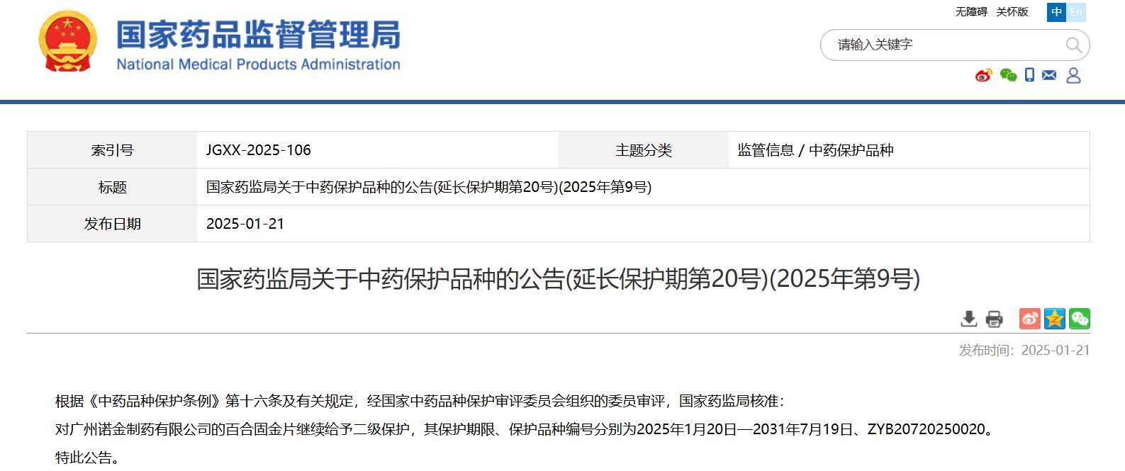 國(guó)家藥監(jiān)局關(guān)于中藥保護(hù)品種的公告(延長(zhǎng)保護(hù)期第20號(hào))(2025年第9號(hào))