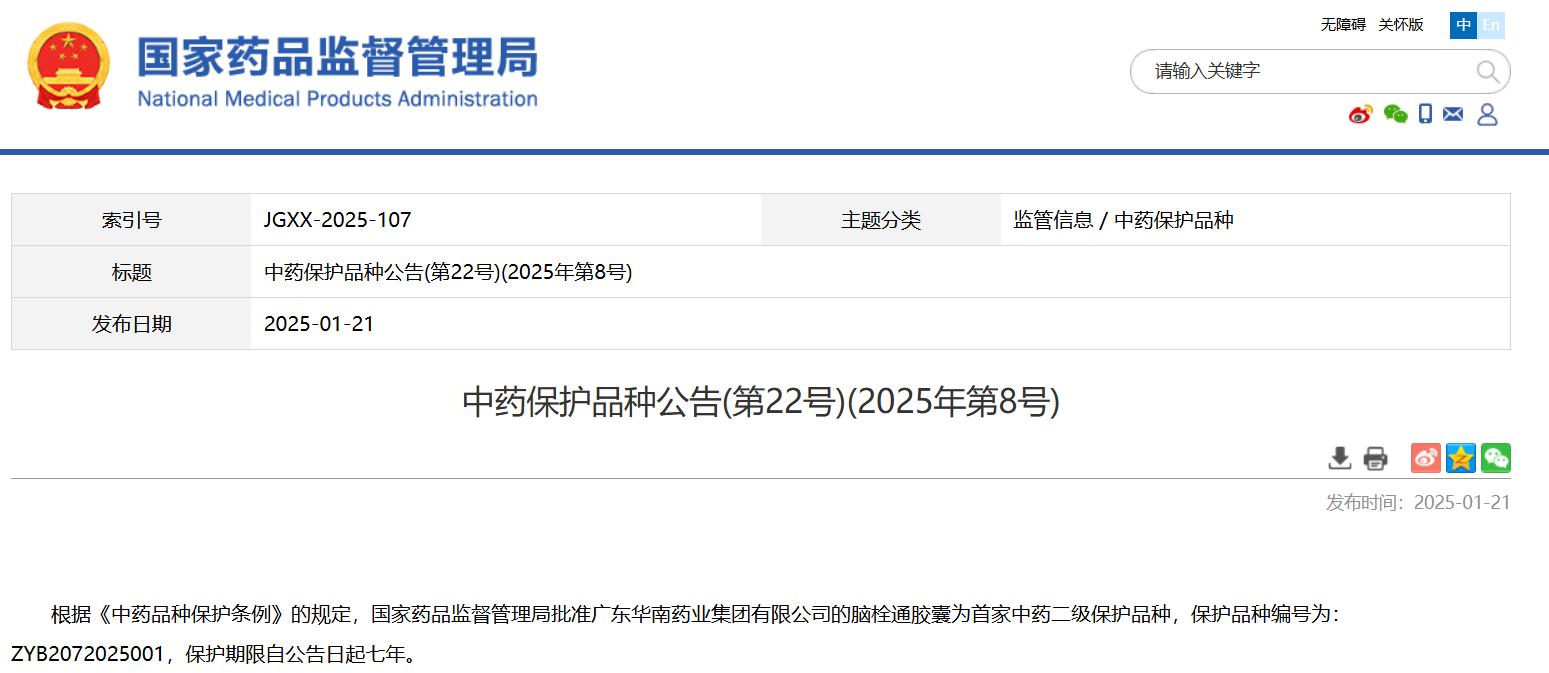 中藥保護(hù)品種公告(第22號(hào))(2025年第8號(hào))