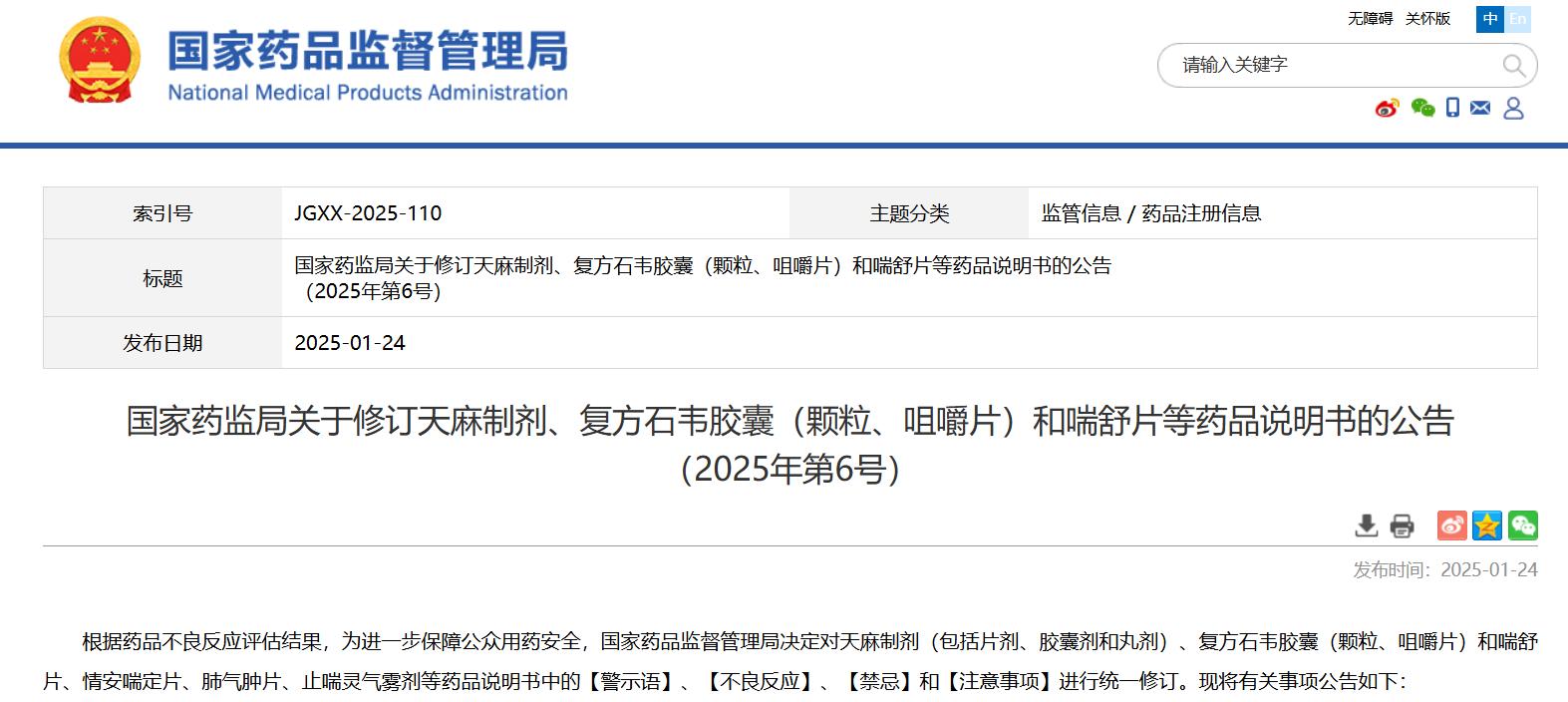 國(guó)家藥監(jiān)局關(guān)于修訂天麻制劑、復(fù)方石韋膠囊(顆粒、咀嚼片)和喘舒片等藥品說(shuō)明書的公告(2025年第6號(hào))