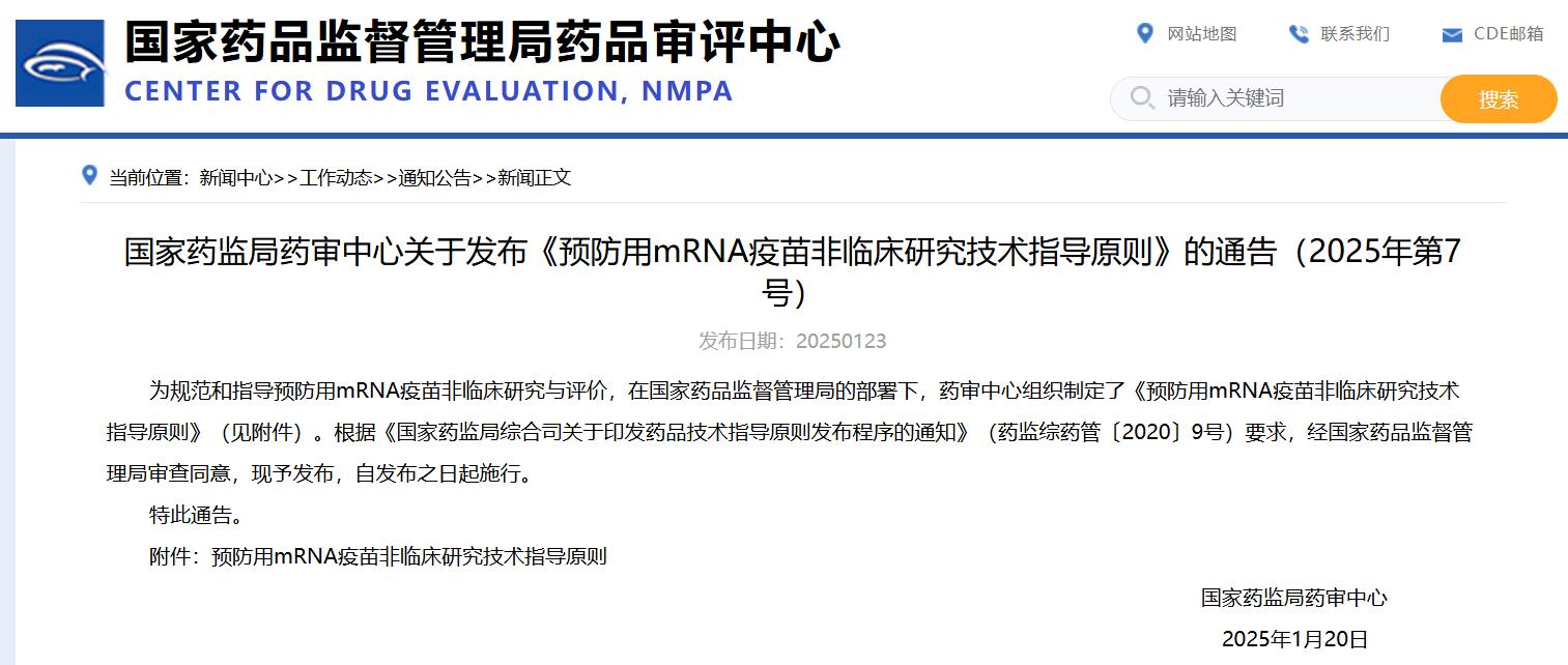 國(guó)家藥監(jiān)局藥審中心關(guān)于發(fā)布《預(yù)防用mRNA疫苗非臨床研究技術(shù)指導(dǎo)原則》的通告(2025年第7號(hào))