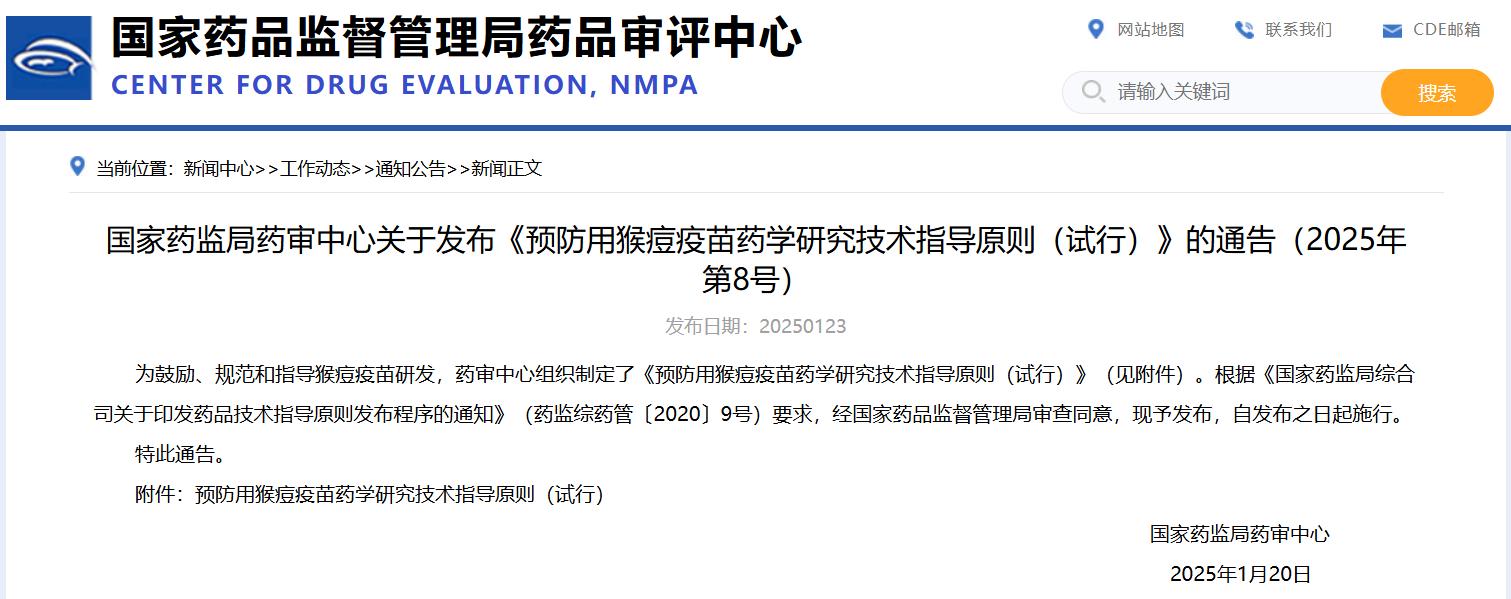 國(guó)家藥監(jiān)局藥審中心關(guān)于發(fā)布《預(yù)防用猴痘疫苗藥學(xué)研究技術(shù)指導(dǎo)原則(試行)》的通告(2025年第8號(hào))