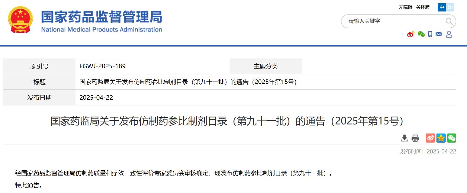 國(guó)家藥監(jiān)局關(guān)于發(fā)布仿制藥參比制劑目錄(第九十一批)的通告(2025年第15號(hào))