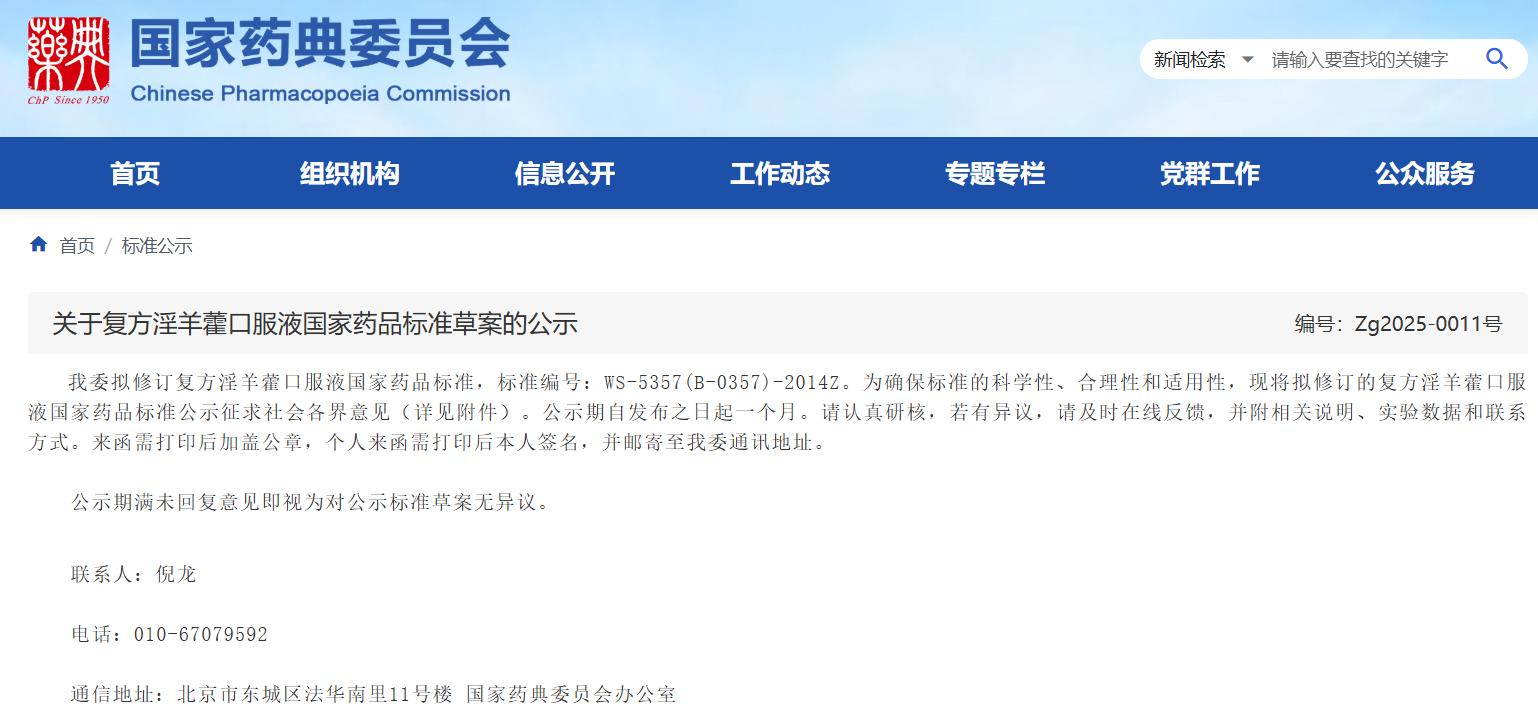 關(guān)于復(fù)方淫羊藿口服液國(guó)家藥品標(biāo)準(zhǔn)草案的公示