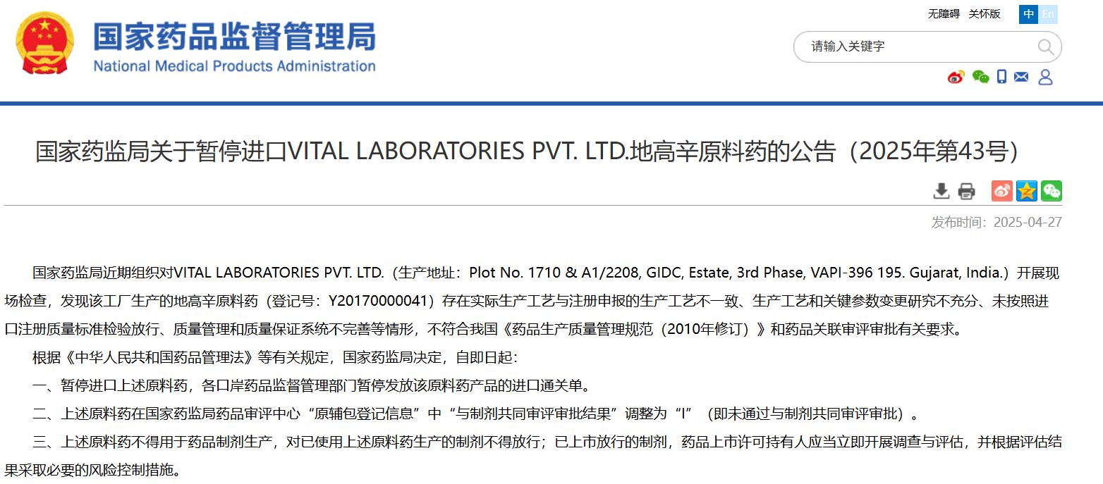 國(guó)家藥監(jiān)局關(guān)于暫停進(jìn)口VITAL LABORATORIES PVT. LTD.地高辛原料藥的公告(2025年第43號(hào))