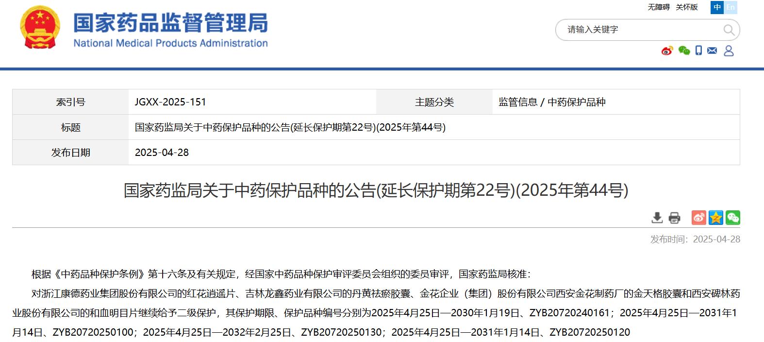國(guó)家藥監(jiān)局關(guān)于中藥保護(hù)品種的公告(延長(zhǎng)保護(hù)期第22號(hào))(2025年第44號(hào))