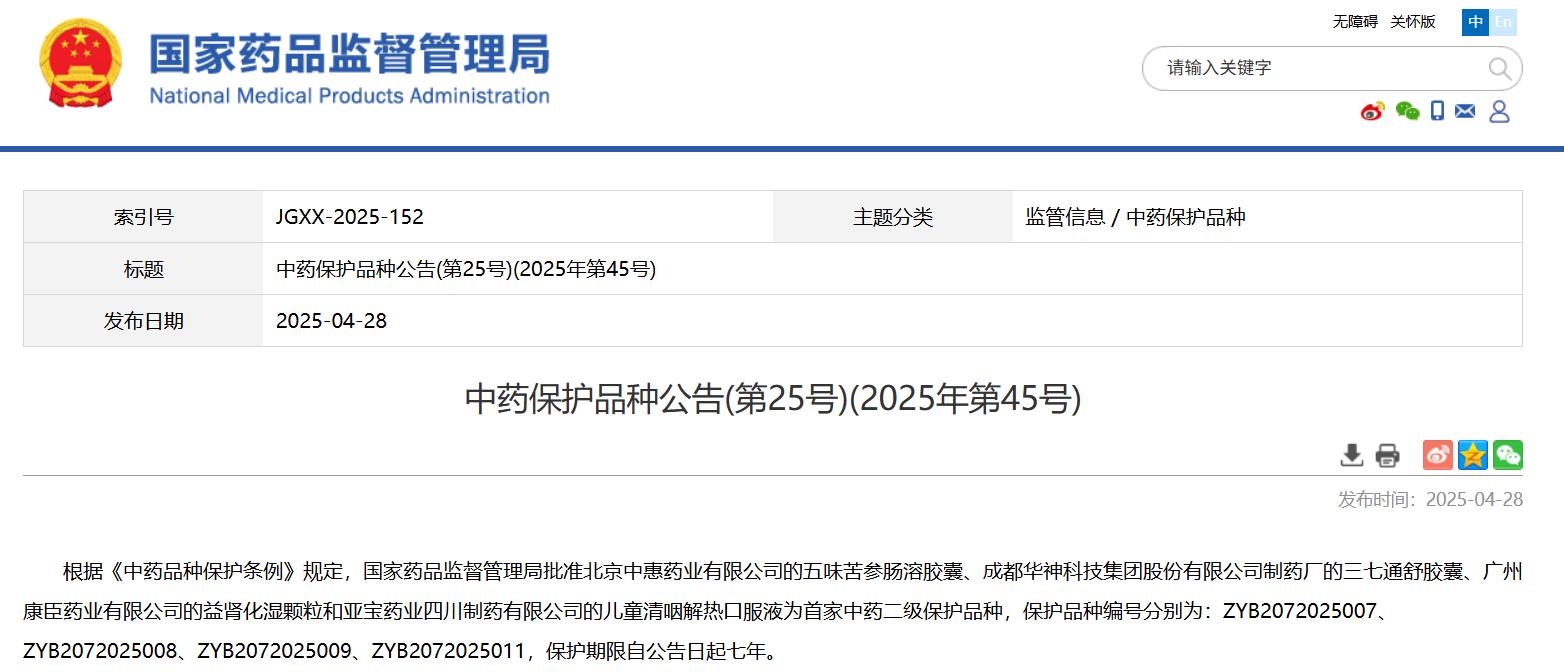 中藥保護(hù)品種公告(第25號(hào))(2025年第45號(hào))