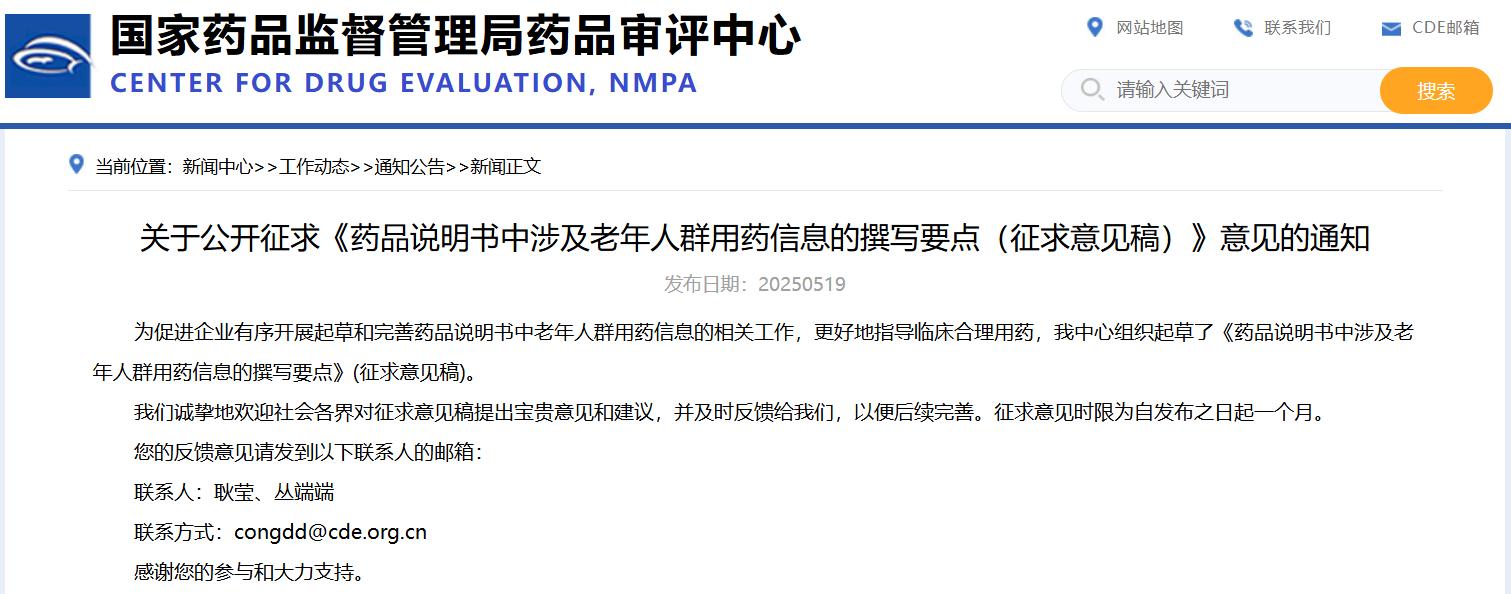 為促進(jìn)企業(yè)有序開展起草和完善藥品說明書中老年人群用藥信息的相關(guān)工作,更好地指導(dǎo)臨床合理用藥,CDE組織起草了《藥品說明書中涉及老年人群用藥信息的撰寫要點(diǎn)》(征求意見稿)。