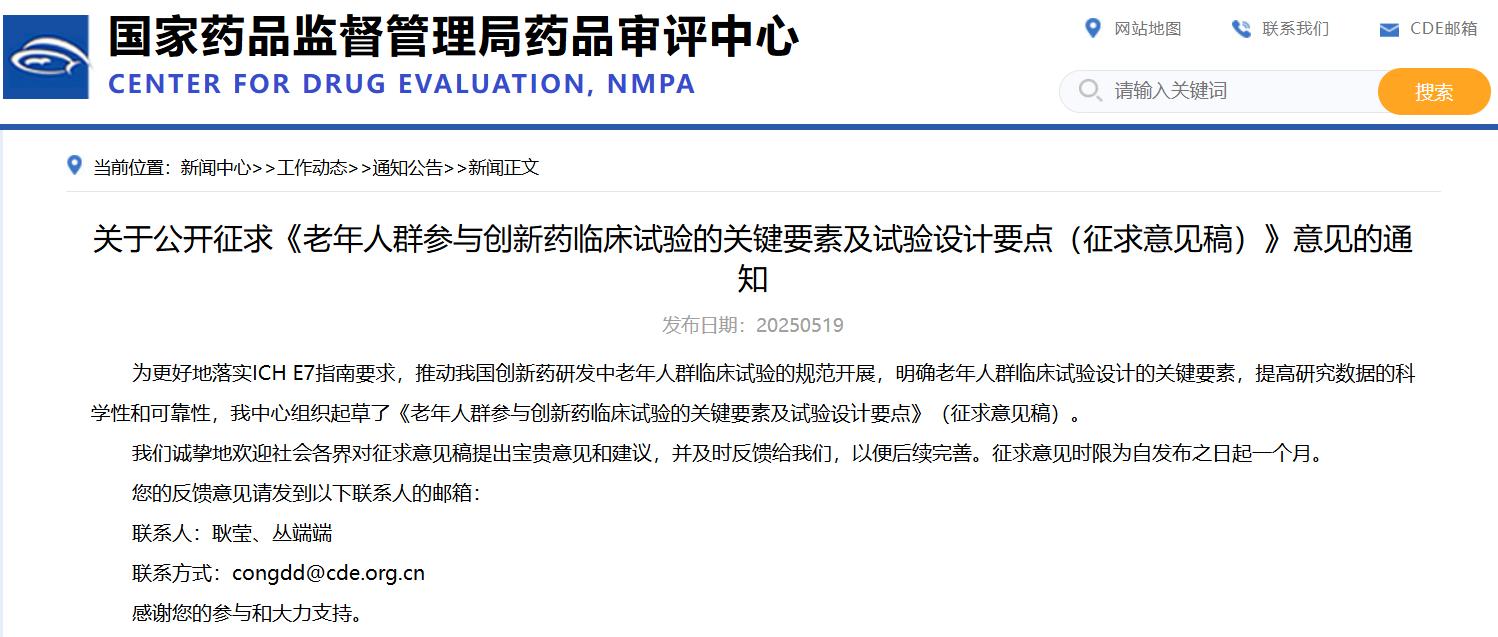 關(guān)于公開征求《老年人群參與創(chuàng)新藥臨床試驗(yàn)的關(guān)鍵要素及試驗(yàn)設(shè)計(jì)要點(diǎn)(征求意見稿)》意見的通知