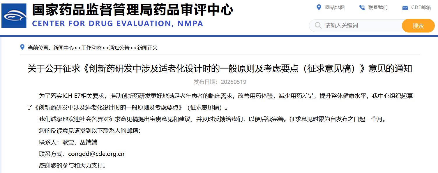 關(guān)于公開征求《創(chuàng)新藥研發(fā)中涉及適老化設(shè)計(jì)時(shí)的一般原則及考慮要點(diǎn)(征求意見稿)》意見的通知
