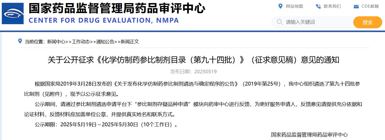 關(guān)于公開征求《化學(xué)仿制藥參比制劑目錄(第九十四批)》(征求意見稿)意見的通知