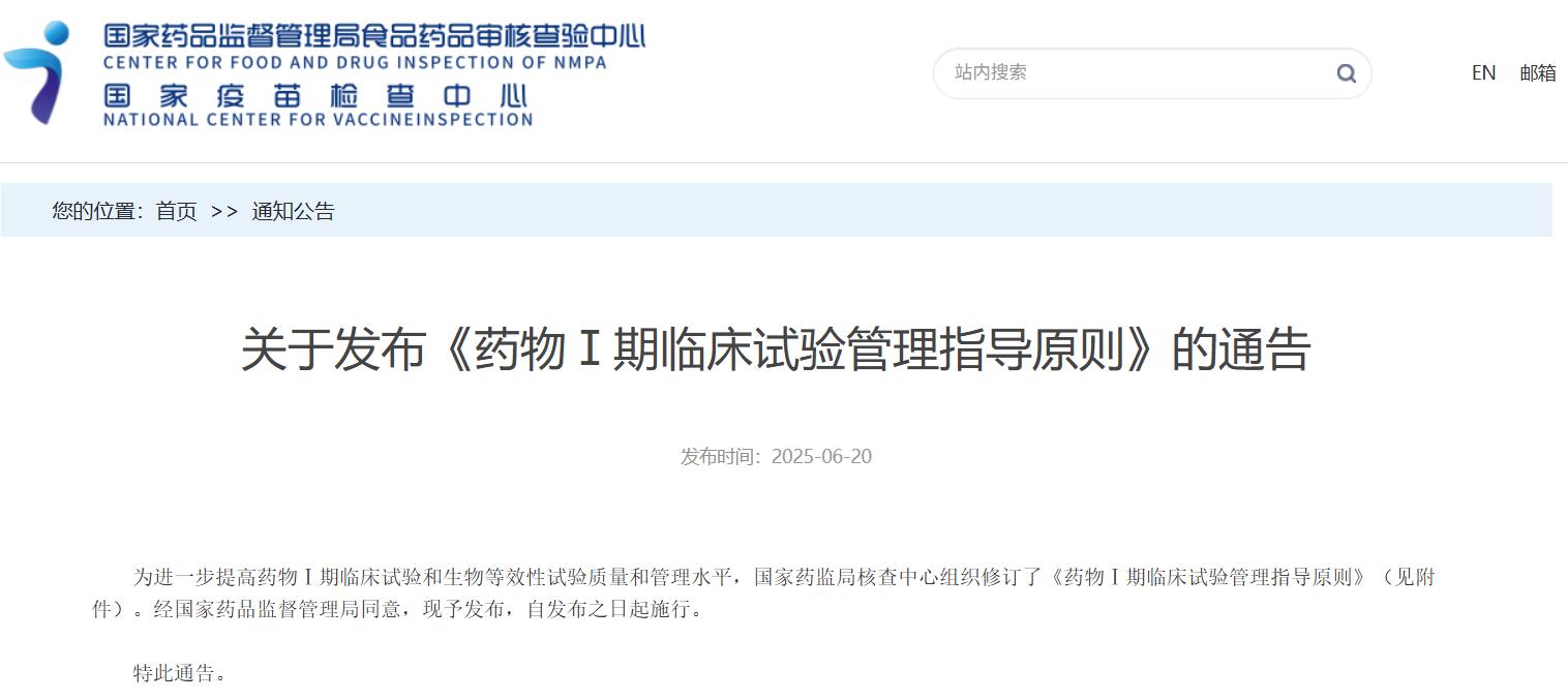 國(guó)家藥品監(jiān)督管理局食品藥品審核查驗(yàn)中心關(guān)于發(fā)布《藥物Ⅰ期臨床試驗(yàn)管理指導(dǎo)原則》的通告