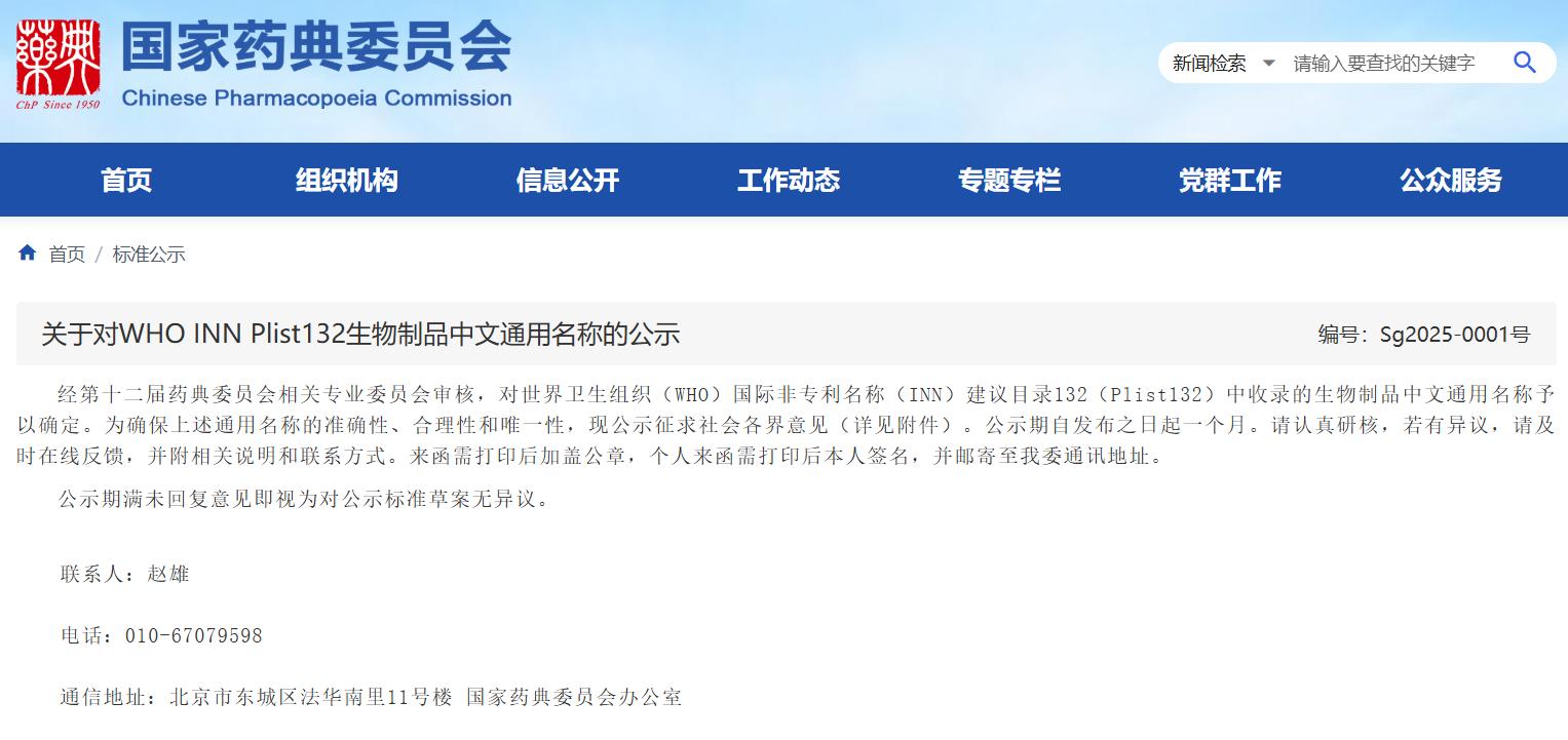 關(guān)于對(duì)WHO INN Plist132生物制品中文通用名稱的公示