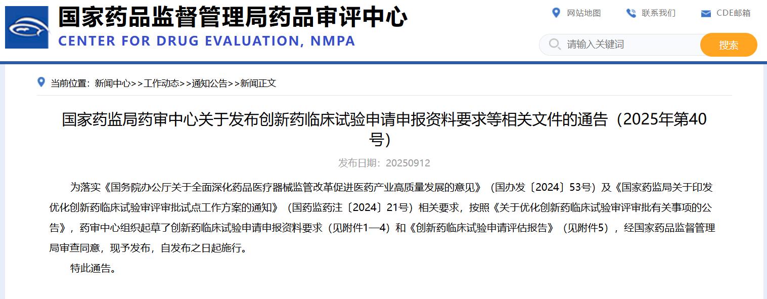 國家藥監(jiān)局藥審中心關于發(fā)布創(chuàng)新藥臨床試驗申請申報資料要求等相關文件的通告(2025年第40號)