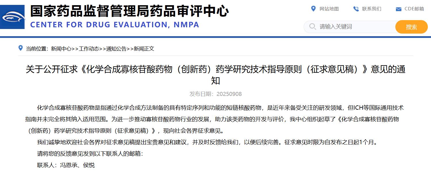 關于公開征求《化學合成寡核苷酸藥物(創(chuàng)新藥)藥學研究技術指導原則(征求意見稿)》意見的通知