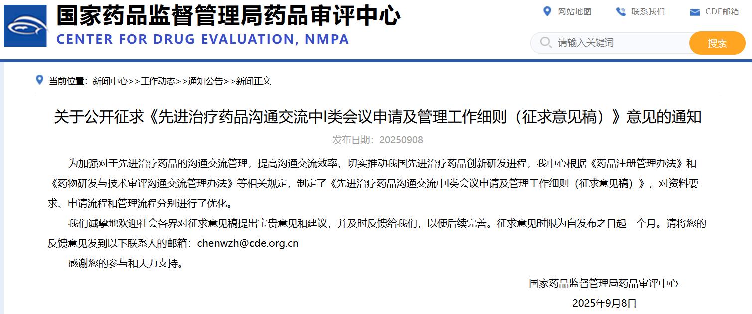 關于公開征求《先進治療藥品溝通交流中I類會議申請及管理工作細則(征求意見稿)》意見的通知