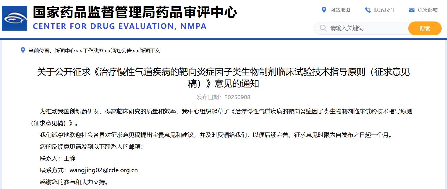 關于公開征求《治療慢性氣道疾病的靶向炎癥因子類生物制劑臨床試驗技術指導原則(征求意見稿)》
