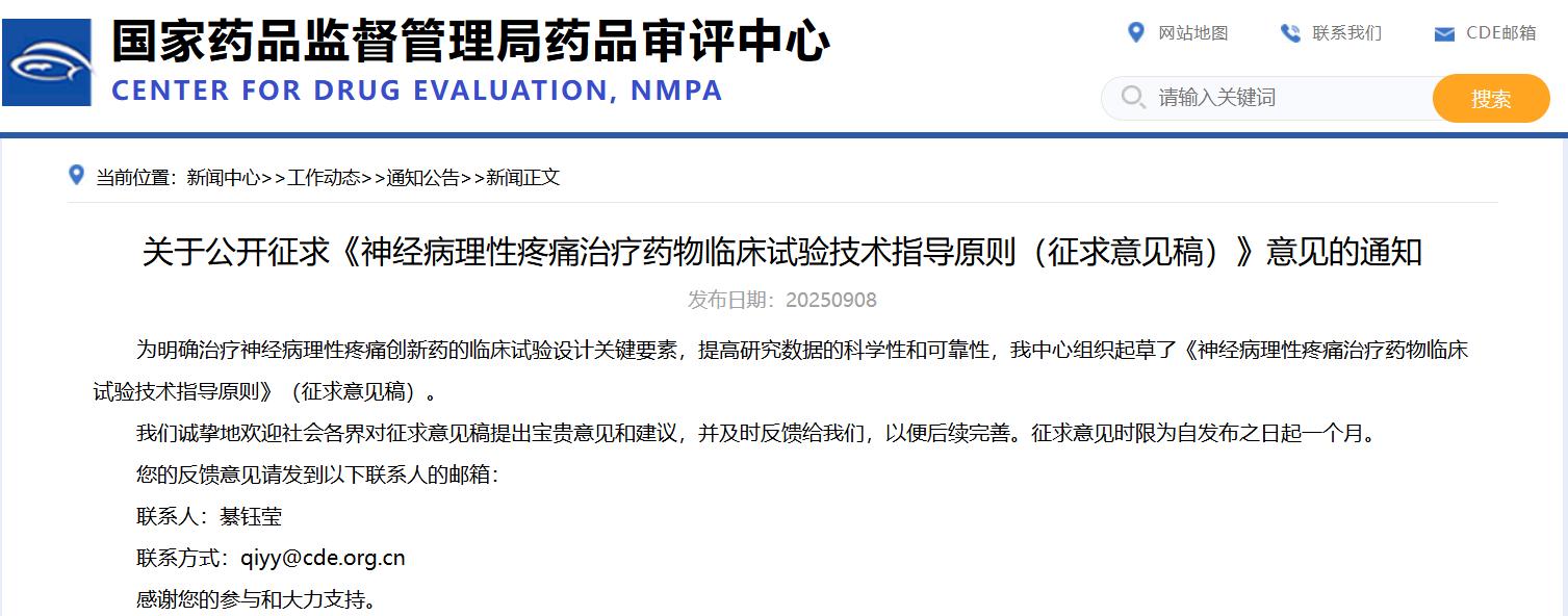 關于公開征求《神經(jīng)病理性疼痛治療藥物臨床試驗技術指導原則(征求意見稿)》意見的通知