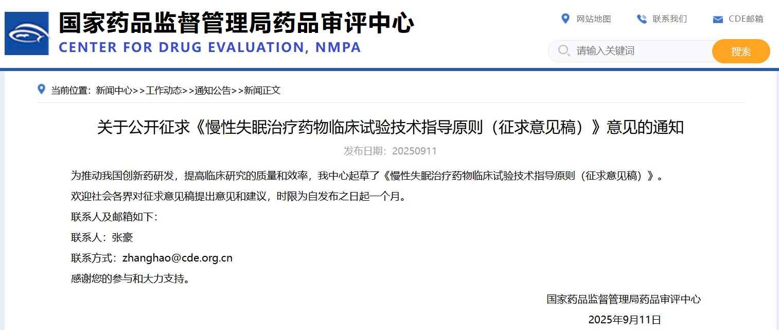 關于公開征求《慢性失眠治療藥物臨床試驗技術指導原則(征求意見稿)》意見的通知