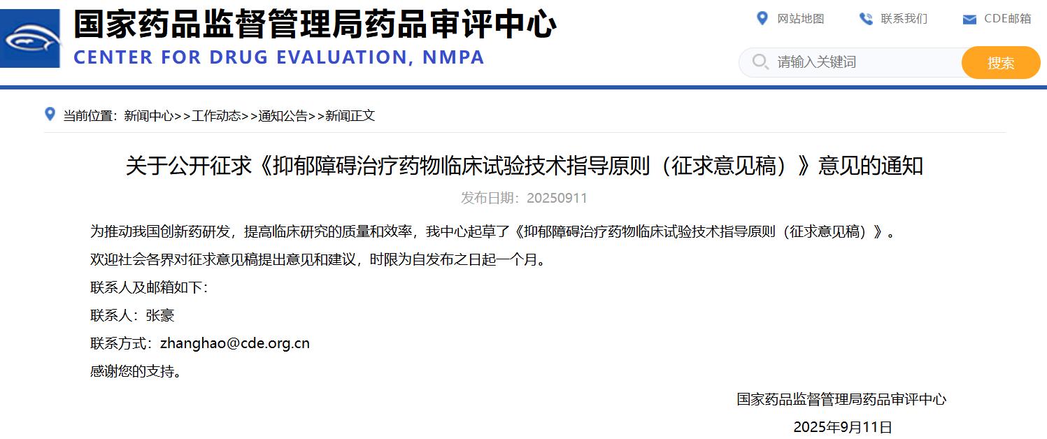 關于公開征求《抑郁障礙治療藥物臨床試驗技術指導原則(征求意見稿)》意見的通知