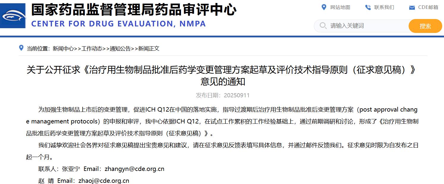 關于公開征求《治療用生物制品批準后藥學變更管理方案起草及評價技術指導原則(征求意見稿)》意見的通知