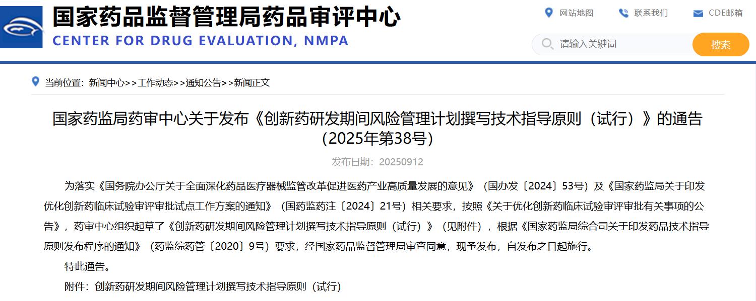 國家藥監(jiān)局藥審中心關于發(fā)布《創(chuàng)新藥研發(fā)期間風險管理計劃撰寫技術指導原則(試行)》的通告(2025年第38號)