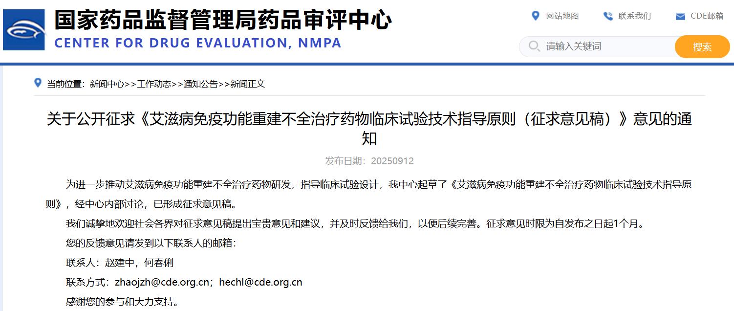 關于公開征求《艾滋病免疫功能重建不全治療藥物臨床試驗技術指導原則(征求意見稿)》意見的通知