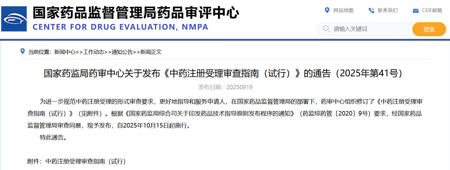國家藥監(jiān)局藥審中心關(guān)于發(fā)布《中藥注冊(cè)受理審查指南(試行)》的通告(2025年第41號(hào))