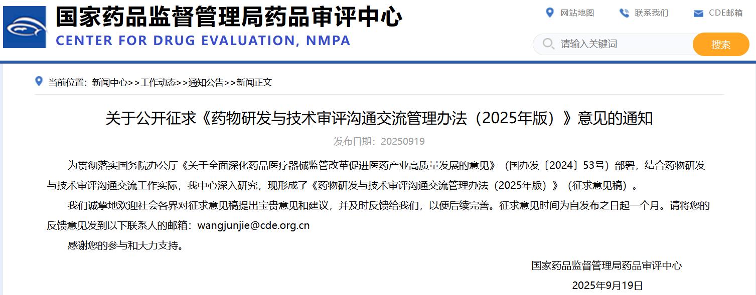 關(guān)于公開征求《藥物研發(fā)與技術(shù)審評(píng)溝通交流管理辦法(2025年版)》意見的通知