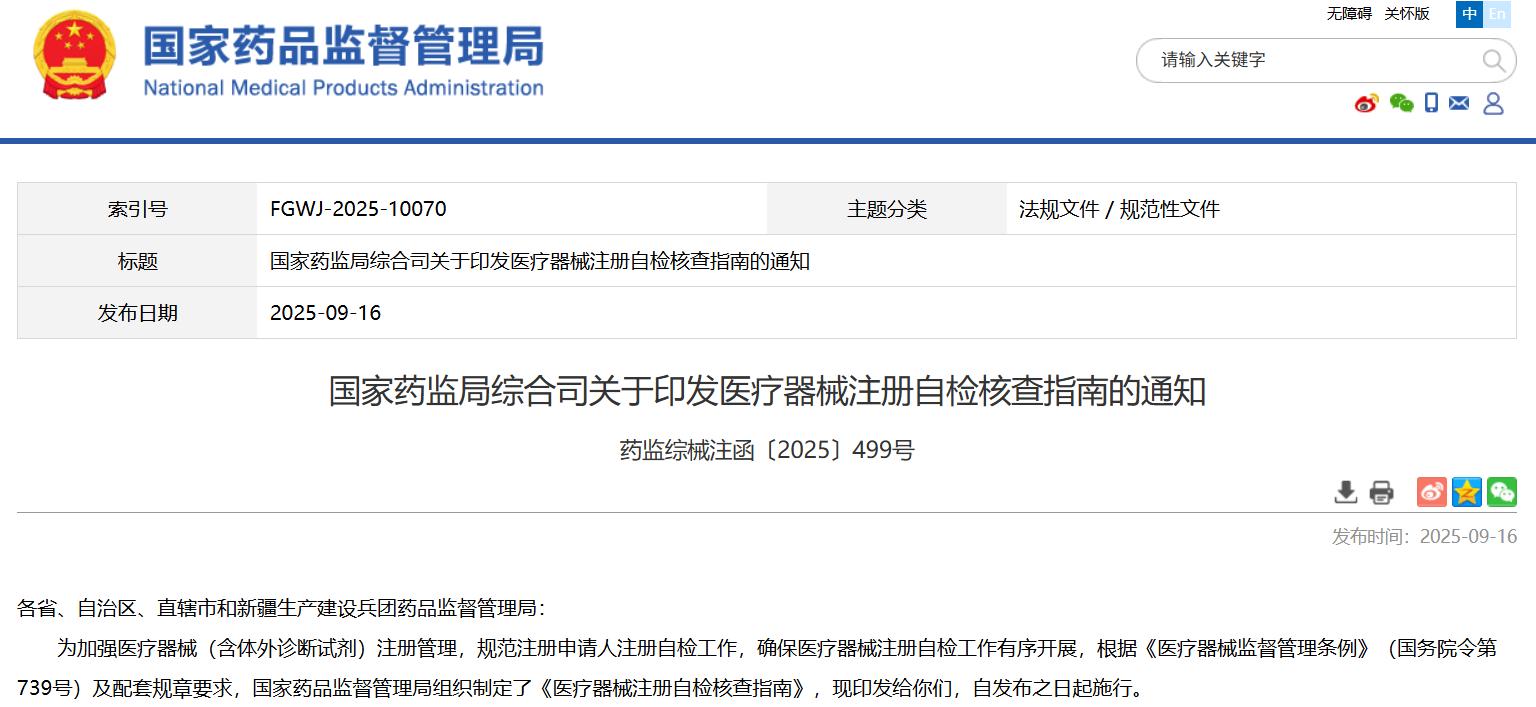 國家藥監(jiān)局綜合司關(guān)于印發(fā)醫(yī)療器械注冊(cè)自檢核查指南的通知