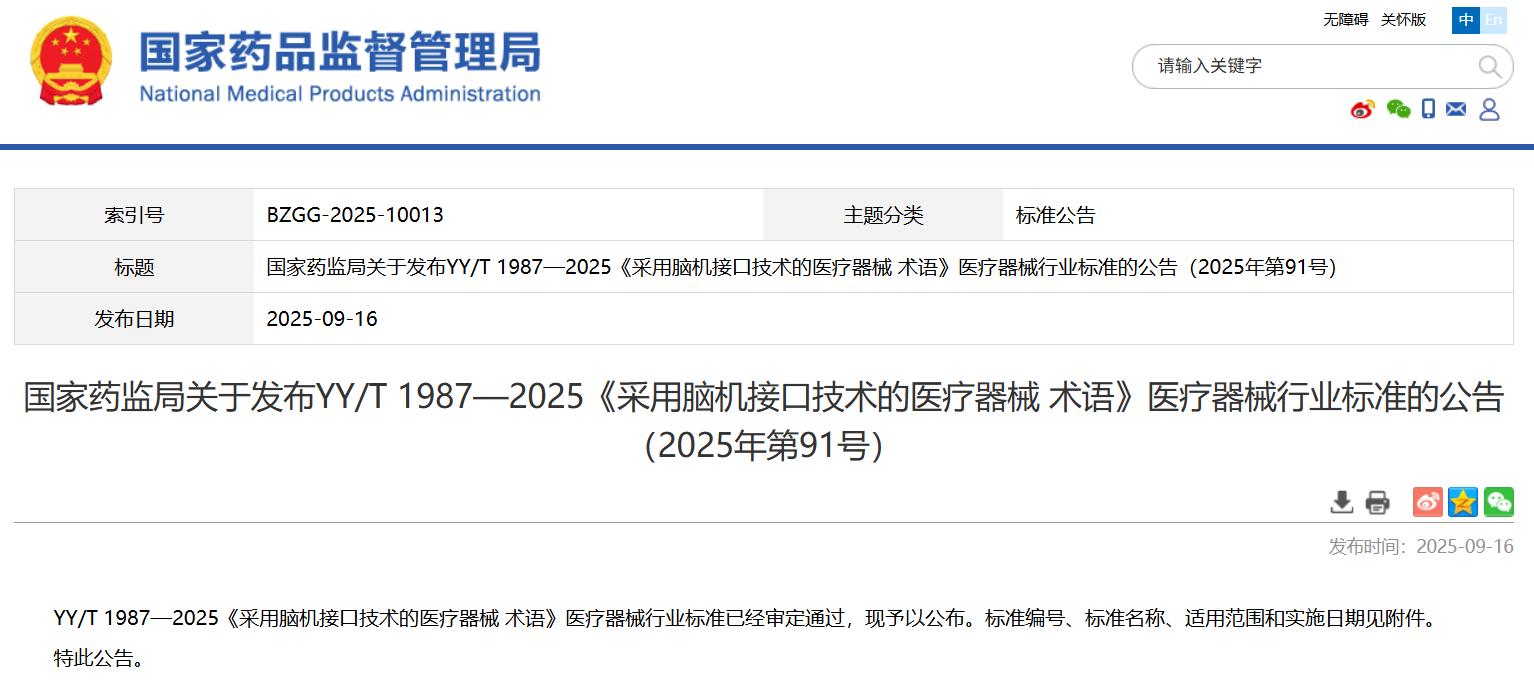 國家藥監(jiān)局關(guān)于發(fā)布YY/T 1987—2025《采用腦機(jī)接口技術(shù)的醫(yī)療器械 術(shù)語》醫(yī)療器械行業(yè)標(biāo)準(zhǔn)的公告(2025年第91號(hào)