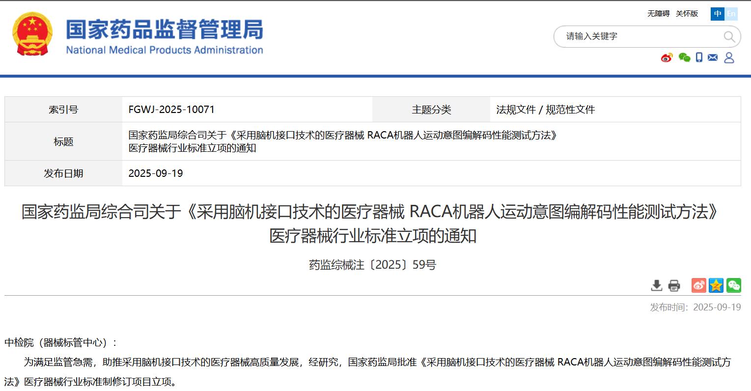 國家藥監(jiān)局綜合司關(guān)于《采用腦機(jī)接口技術(shù)的醫(yī)療器械 RACA機(jī)器人運(yùn)動(dòng)意圖編解碼性能測(cè)試方法》醫(yī)療器械行業(yè)標(biāo)準(zhǔn)立項(xiàng)的通知