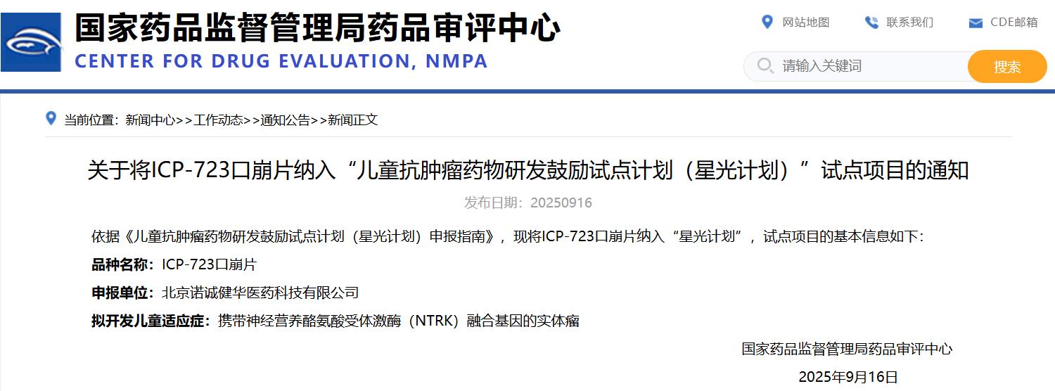 關(guān)于將ICP-723口崩片納入“兒童抗腫瘤藥物研發(fā)鼓勵(lì)試點(diǎn)計(jì)劃(星光計(jì)劃)”試點(diǎn)項(xiàng)目的通知