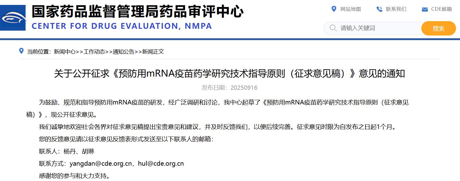 關(guān)于公開征求《預(yù)防用mRNA疫苗藥學(xué)研究技術(shù)指導(dǎo)原則(征求意見稿)》意見的通知