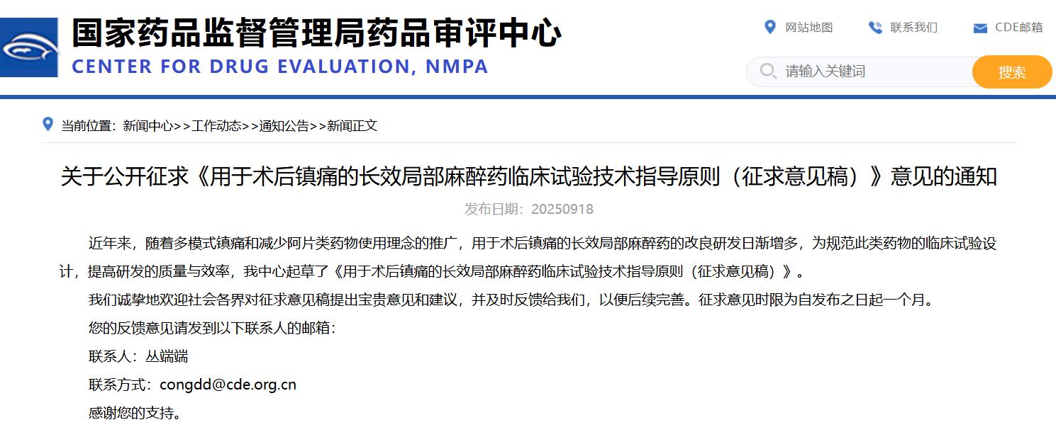 關(guān)于公開征求《用于術(shù)后鎮(zhèn)痛的長效局部麻醉藥臨床試驗(yàn)技術(shù)指導(dǎo)原則(征求意見稿)》意見的通知